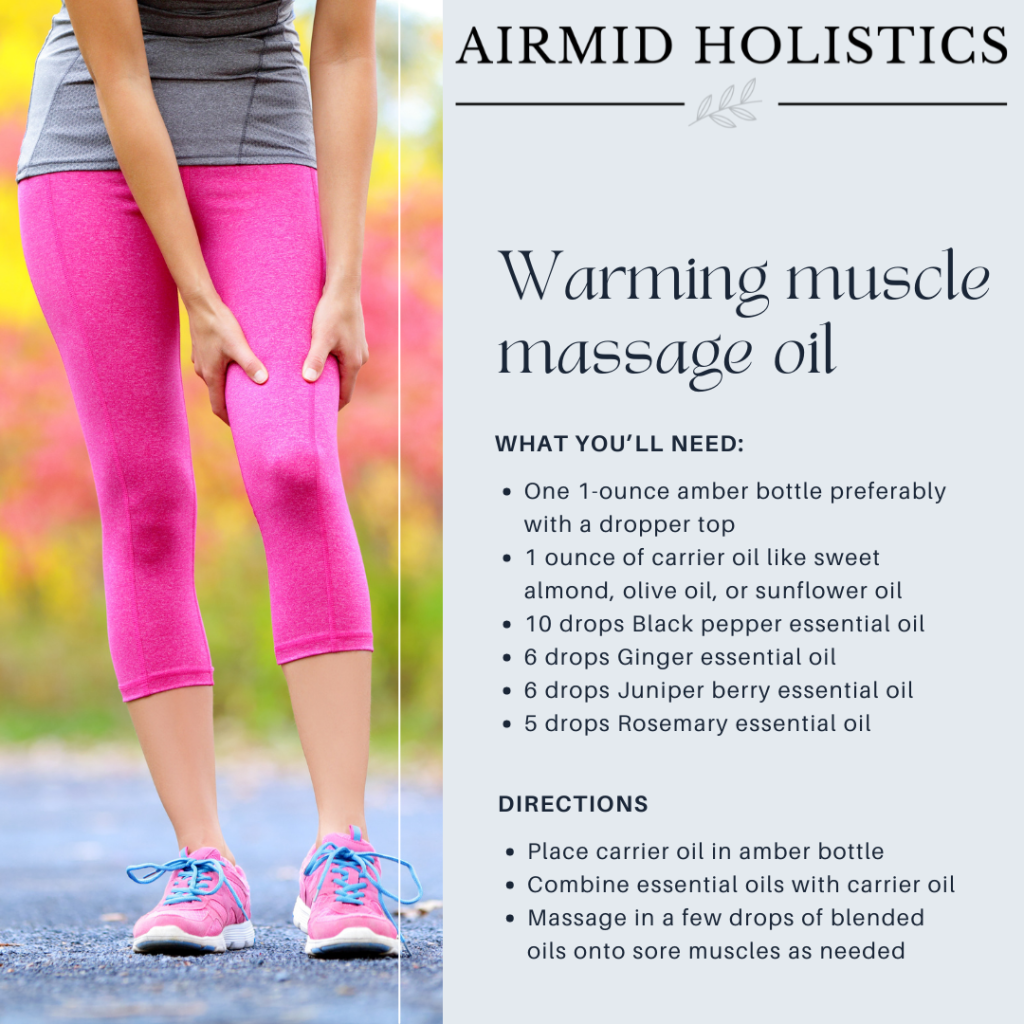 With the new year comes new year resolutions, so if you are back to the gym or doing at-home workouts this great warming muscle massage blend may come in handy! You’ll need your essential oils, a dark colored one-ounce bottle, and one ounce (approximately 2 tablespoons) of your preferred carrier oil.